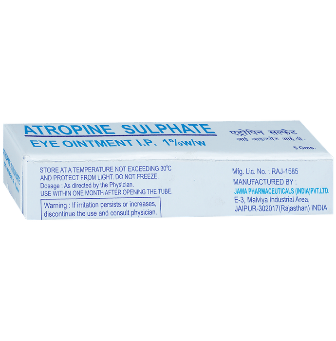 Manufacturer details:                                        Marketer details:Jawa Pharmaceuticals Pvt Ltd | 548 , Udai Marg , Tilak Nagar , Jaipur-302004 (Rajasthan),                                                Description:Atropine Eye Ointment is used to treat myopia and inflammation in the eyes (uveitis or iritis). It is also used in induce cycloplegia for eye examination and diagnose eye problems like blurred vision or squint in children. Atropine Eye Ointment is for external use only. Use it in the dose and duration as directed by your doctor. Read the instructions carefully before using the medicine. Wash the hands thoroughly before and after using Atropine Eye Ointment. Doing so will help avoid the risk of any infection. Do not rub the eyes after instilling the medicine, as it can lead to redness or irritation. Continue the medicine until the prescribed course is complete.This medicine may have some minor and temporary side effects such as blurry vision, photophobia, decreased tear production, stinging in the eyes, and high blood pressure. These episodes should start receding after a few doses. However, if these side effects persist or become bothersome for your child, report to the doctor without any delay.Before you use this medicine, let your doctor know if you have a history of allergic reactions with any of the components of this product. Let your doctor also know about any medical conditions such as heart problems, blood disorders, airway obstruction, lung anomaly, gastrointestinal problems, skin disorders, liver impairment, or kidney malfunction. Pregnant and breastfeeding women should consult their doctor before using this medicine.