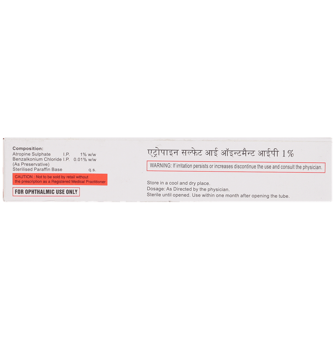 Manufacturer details:                                                                                Marketer details:Pharmatak Opthalmics Pvt Ltd | 50-52, The Discovery, Dattapada Road, Borivali (E), Mumbai – 400 066, Maharashtra,                                                                                                Description:Atropine Sulphate 1% Eye Ointment is used to treat myopia and inflammation in the eyes (uveitis or iritis). It is also used in induce cycloplegia for eye examination and diagnose eye problems like blurred vision or squint in children. Atropine Sulphate 1% Eye Ointment is for external use only. Use it in the dose and duration as directed by your doctor. Read the instructions carefully before using the medicine. Wash the hands thoroughly before and after using Atropine Sulphate 1% Eye Ointment. Doing so will help avoid the risk of any infection. Do not rub the eyes after instilling the medicine, as it can lead to redness or irritation. Continue the medicine until the prescribed course is complete.This medicine may have some minor and temporary side effects such as blurry vision, photophobia, decreased tear production, stinging in the eyes, and high blood pressure. These episodes should start receding after a few doses. However, if these side effects persist or become bothersome for your child, report to the doctor without any delay.Before you use this medicine, let your doctor know if you have a history of allergic reactions with any of the components of this product. Let your doctor also know about any medical conditions such as heart problems, blood disorders, airway obstruction, lung anomaly, gastrointestinal problems, skin disorders, liver impairment, or kidney malfunction. Pregnant and breastfeeding women should consult their doctor before using this medicine.