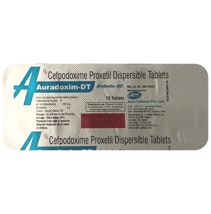 Manufacturer details:                                        Marketer details:Aura Lifecare Private Limited | Factory & Regd. Office : Survey No. 254/14/1, Jarod-Savli Road, PO : Karachiya, Tal : Savli,Dist. : Vadodara, Gujarat – 391520 Mobile No: 75740 00807 / 92650 65012 CIN : U24230GJ2012PTC070929 GSTIN :,                                                Description:Auradoxim-DT Tablet is an antibiotic medicine used to treat bacterial infections in your body. It is effective in infections of the lungs (eg. pneumonia), urinary tract, ear, nasal sinus, throat, and skin. It kills bacteria, which helps to improve your symptoms and cure the infection. Auradoxim-DT Tablet should be taken with food. You should take it regularly at evenly spaced intervals as per the schedule prescribed by your doctor. Taking it at the same time every day will help you to remember to take it. The dose will depend on what you are being treated for, but you should always complete a full course of this antibiotic as prescribed by your doctor. Do not stop taking it until you have finished, even when you feel better. If you stop taking it early, some bacteria may survive and the infection may come back. It will not work for viral infections such as flu or the common cold. Using any antibiotic when you do not need it can make it less effective for future infections.The most common side effects of this medicine include rash, nausea, and diarrhea. Taking this medicine along with some food may help to prevent indigestion and upset stomach. Consult your doctor if you find these side effects bother or worry you. Before using it, you should tell your doctor if you are allergic to any antibiotics or have any kidney or liver problems. This medicine is generally regarded as safe to use in pregnancy and breastfeeding if prescribed by your doctor. It may blur your vision or make you feel sleepy and dizzy. Do not drive if these symptoms occur.