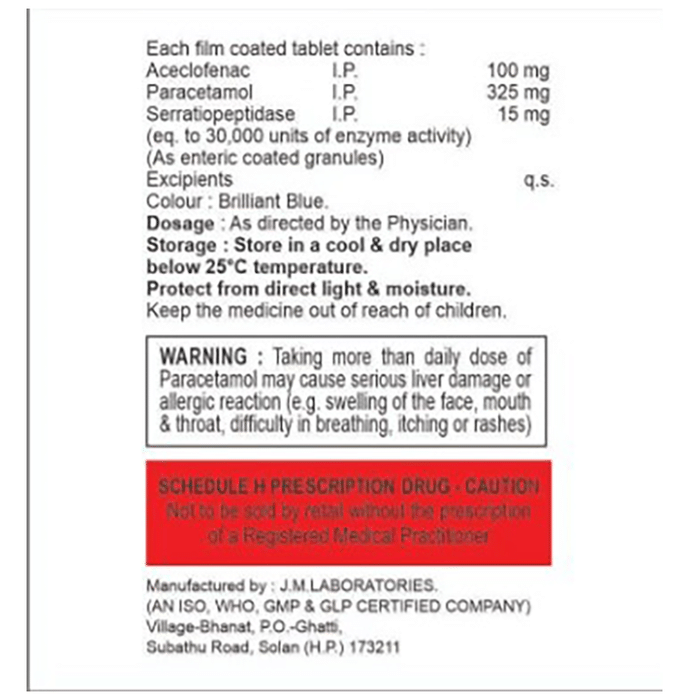 Marketer:Alphaura Pharmaceutical & Healthcare LLP,Composition:Aceclofenac (100mg) + Paracetamol (325mg) + Serratiopeptidase (15mg),medicine_type:,