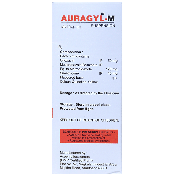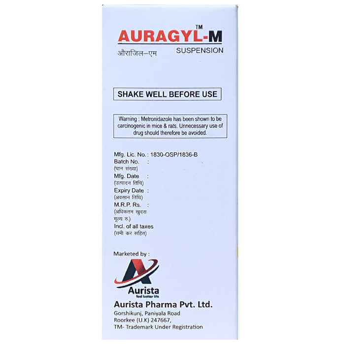 Manufacturer details:                                                                                Marketer details:Aurista Pharma Pvt Ltd. | ROORKEE HARIDWAR, Uttarakhand(INDIA) 247667,                                                                                                Description:Auragyl-M Oral Suspension is given to children for the treatment of bacterial infections of the teeth, lungs, gastrointestinal tract, urinary tract, and genital tract. This medicine is also given as an empirical antibiotic for infected diarrhea mixed with blood and serious infections like peritonitis. Give Auragyl-M Oral Suspension to your child orally, preferably at a fixed time, either before or after meals. In case your child develops a stomach upset, prefer giving it with meals. Generally, this medicine is prescribed to be given two times a day, in the morning and evening. If your child vomits within 30 minutes of intake, repeat the same dose but do not double the dose if it is time for the next dose. Never change the dose, time, and way prescribed by the doctor since these depend upon the type and severity of the infection, your child’s age, and body weight.In some cases, this medicine may cause some minor and temporary side effects, including nausea, vomiting, weight loss, metallic taste, headache, loss of appetite, abdominal cramps, and mild skin rash. These side effects are temporary and recede when your child gets used to the medicine. In case the side effects persist or start bothering your child, consult your child’s doctor without any delay.Narrate your child’s complete medical history to your child’s doctor, including any previous episode of allergy, heart problem, liver impairment, and kidney malfunction. This information is critical for dose alterations and for planning your child’s overall treatment.