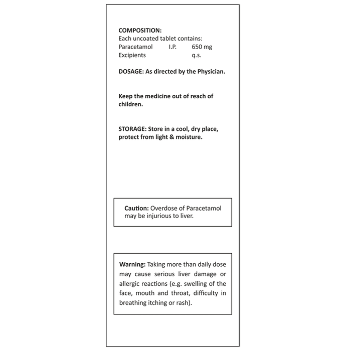 Package:Strip,Qty:10,Product Form:Tablet ,prescription_required:,Fact_Box:Chemical Class :: P-Aminophenol Derivative|Habit Forming :: No|Therapeutic Class :: PAIN ANALGESICS|Action Class :: Analgesic & Antipyretic-PCM, primary_use:Pain relief|Treatment of Fever,storage:Store below 30°C,                  common_side_effect:Headache | Constipation | Itching | Insomnia (difficulty in sleeping) | Nausea | Vomiting,      MANUFACTURER_ADDRESS:Factory & Regd. Office : Survey No. 254/14/1, Jarod-Savli Road, PO : Karachiya, Tal : Savli,Dist. : Vadodara, Gujarat – 391520 Mobile No: 75740 00807 / 92650 65012 CIN : U24230GJ2012PTC070929 GSTIN :,        country_of_origin:India,Q_A:</q_a>,                            How it works:,
