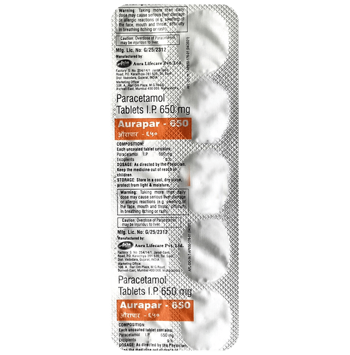 Manufacturer details:                                        Marketer details:Aura Lifecare Private Limited | Factory & Regd. Office : Survey No. 254/14/1, Jarod-Savli Road, PO : Karachiya, Tal : Savli,Dist. : Vadodara, Gujarat – 391520 Mobile No: 75740 00807 / 92650 65012 CIN : U24230GJ2012PTC070929 GSTIN :,                                                Description:Aurapar 650 Tablet helps relieve pain and fever by blocking the release of certain chemical messengers responsible for fever and pain. It is used to treat headaches, migraine, toothaches, sore throats, period (menstrual) pains, arthritis, muscle aches, and the common cold. Aurapar 650 Tablet may be prescribed alone or in combination with another medicine. You should take it regularly as advised by your doctor. It is usually best taken with food otherwise it may upset your stomach. Do not take more or use it for longer than recommended.Side effects are rare if this medicine is used correctly but this medicine may cause stomach pain, nausea, and vomiting in some people. Consult your doctor if any of these side effects bother you or do not go away.This medicine is widely prescribed and considered safe but is not suitable for everybody. Before taking it, let your doctor know if you have liver or kidney problems or are using blood-thinning medicines. It may affect the dose or suitability of this medicine. Let your doctor know about all the other medicines you are taking because they may affect, or be affected by, this medicine.