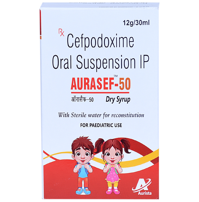 Manufacturer details:                                        Marketer details:Aurista Pharma Pvt Ltd. | ROORKEE HARIDWAR, Uttarakhand(INDIA) 247667,                                                Description:Aurasef 50 Dry Syrup is an antibiotic medicine. It is commonly given to children for the treatment of a wide range of bacterial infections targeting the ears, eyes, nose, throat, lungs, skin, gastrointestinal tract, and urinary tract. It is also effective in treating typhoid fever in children and adolescents. Give this medicine to your child an hour before or two hours after meals. If your child develops a stomach upset, prefer giving it with food. Make sure to stick to the prescribed dose because it is given keeping in mind the type of infection, its severity, and the age and body weight of your child. In case your child gags and expels the medicine within 30 mins of intake, repeat the same dose but do not double dose if it’s the time for the next dose.Do not give this medicine to your child in case of cold and flu symptoms as this medicine is an antibiotic and doesn’t work on infections caused by viruses. Doctors prescribe this medicine for cough and cold only when they detect any underlying secondary bacterial infection.Some of the minor and temporary side effects of this medicine include vomiting, diarrhea, nausea, rash, and headache. Usually, these episodes subside once your child’s body adapts to the medicine. However, if these effects persist or become bothersome for your child, call the doctor right away.Narrate your child’s complete medical history to your child’s doctor, including any previous episodes of allergy, heart problem, blood disorder, birth defects, airway obstruction, lung anomaly, gastrointestinal problem, skin disorder, liver impairment, and kidney malfunction. This information is critical for dose alterations and for planning your child’s overall treatment.