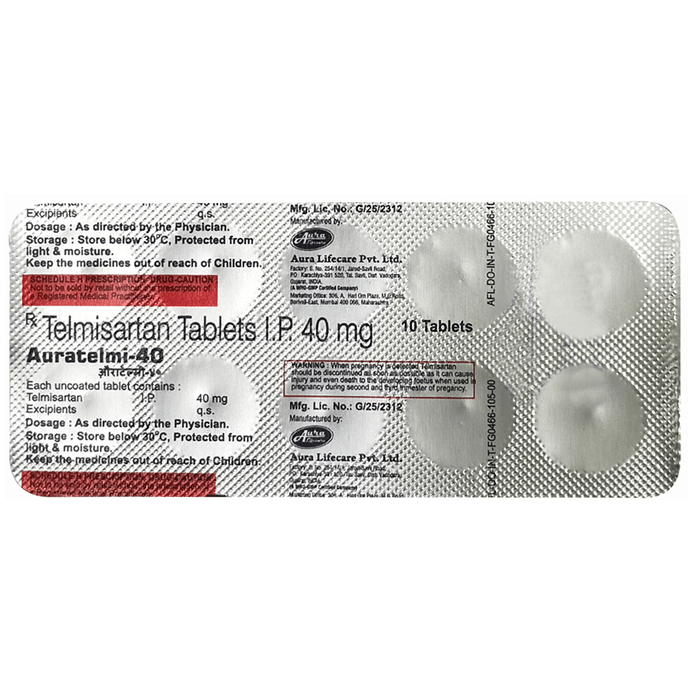Manufacturer details:                                                                                Marketer details:Aura Lifecare Private Limited | Factory & Regd. Office : Survey No. 254/14/1, Jarod-Savli Road, PO : Karachiya, Tal : Savli,Dist. : Vadodara, Gujarat – 391520 Mobile No: 75740 00807 / 92650 65012 CIN : U24230GJ2012PTC070929 GSTIN :,                                                                                                Description:Auratelmi 40 Tablet is a medicine used to treat high blood pressure and heart failure. Lowering blood pressure helps to prevent future heart attacks and strokes. This medicine is also effective in preserving kidney function in patients with diabetes. Auratelmi 40 Tablet can be prescribed either alone or in combination with other medicines. It may be taken with or without food during the day or at night. However, try to take it at the same time each day to get the most benefit. It is important to continue taking it regularly even if you feel well or if your blood pressure is controlled. Most people with high blood pressure do not feel ill, but if you stop taking this medicine, your condition could get worse. This is a widely used medicine and is considered safe for long-term use.Making some changes in your lifestyle will also help lower your blood pressure. These may include regular exercise, losing weight, smoking cessation, reducing alcohol intake, and reducing the amount of salt in your diet as advised by your doctor.This medicine is tolerated well by most patients and has few side effects. However, it may cause hypotension (low blood pressure) in some people. Let your doctor know if you experience any of these side effects. They may be able to help by reducing the dosage or by prescribing you an alternate medicine.Before taking this medicine, let your doctor know if you have any kidney or liver problems. Pregnant or breastfeeding mothers should also consult their doctor before taking it. Your doctor may check your kidney function, blood pressure, and potassium levels in your blood at regular intervals while you are taking this medicine.