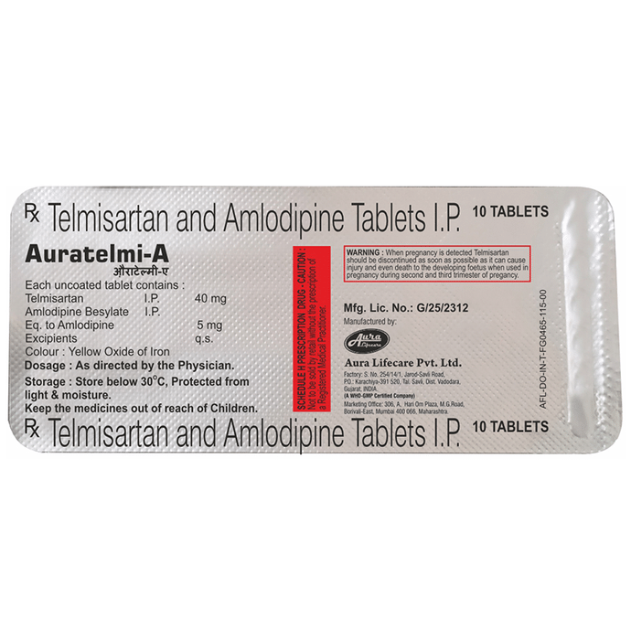 Manufacturer details:                                        Marketer details:Aura Lifecare Private Limited | Factory & Regd. Office : Survey No. 254/14/1, Jarod-Savli Road, PO : Karachiya, Tal : Savli,Dist. : Vadodara, Gujarat – 391520 Mobile No: 75740 00807 / 92650 65012 CIN : U24230GJ2012PTC070929 GSTIN :,                                                Description:Auratelmi-A Tablet contains two medicines, both of which help to control high blood pressure. It lowers the blood pressure by relaxing the blood vessels and making it easier for your heart to pump blood around your body. This will reduce your risk of having a heart attack or a stroke. Auratelmi-A Tablet may be taken on an empty stomach or along with food. However, it is better to take it regularly at a fixed time each day, as prescribed by your doctor. The dose will depend on your condition and how you respond to the medicine. It’s important to keep taking this medicine even if you feel well. By lowering your blood pressure, it is reducing your risk of heart attack or stroke so do not stop taking it unless your doctor tells you to. You can help this medication work better by making a few changes to your lifestyle such as keeping active, stopping smoking, and eating a low salt and low-fat diet.The most common side effects of this medicine include swelling in your ankles or feet (edema), headache, sleepiness, dizziness, tiredness, and upset stomach. Since it may cause sleepiness and dizziness, do not drive or do anything requiring concentration until you know how it affects you. Talk to your doctor if any of the side effects bother you or will not go away.Before taking this medicine, let your doctor know if you have any kidney or liver problems or severe dehydration. Pregnant or breastfeeding women should also consult their doctor before taking it. While using this medicine, your blood pressure will need to be checked often and your kidney function may also need to be tested.