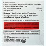 Package:Strip,Qty:10,Product Form:Tablet DT ,prescription_required:Prescription Required,Fact_Box:Chemical Class :: Broad Spectrum (Third & fourth generation cephalosporins)|Habit Forming :: No|Therapeutic Class :: ANTI INFECTIVES|Action Class :: Cephalosporins: 3 generation, primary_use:Treatment of Bacterial infections,storage:Store below 30°C,                  common_side_effect:Rash | Nausea | Diarrhea,      MANUFACTURER_ADDRESS:P S Tower Magarpatta Rd, Opp to Nobel Hospital, Magarpatta Rd, Hadapsar, Pune – 411028, Magapatta City,        country_of_origin:India,Q_A:</q_a>,                            How it works:,