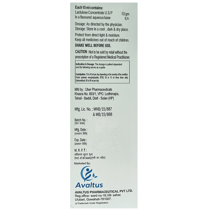 Marketer:Avaltus Pharmaceutical Pvt.Ltd.,Composition:Lactulose (10gm/15ml),medicine_type:,