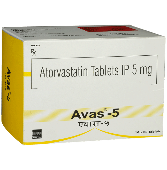 Manufacturer details:                                        Marketer details:Micro Labs Ltd | 27, RACE COURSE ROAD, BANGALORE-560 001, INDIA,                                                Description:Avas 5 Tablet belongs to a group of medicines called statins. It is used to lower cholesterol and to reduce the risk of heart diseases. Cholesterol is a fatty substance that builds up in your blood vessels and causes narrowing, which may lead to a heart attack or stroke. Avas 5 Tablet is a widely prescribed medicine and is regarded as safe for long-term use when taken as per the doctor’s advice. It can be taken with a meal or on an empty stomach. You can take it at any time of the day but try to take it at about the same time each day. Most people with high cholesterol do not feel ill, but stopping your medicine may increase your cholesterol levels thereby increasing your risk of heart disease and stroke.It is important to have your cholesterol levels checked regularly. This medicine is only one part of the treatment program which should also include a healthy diet, regular exercise, smoking cessation, moderation of alcohol intake, and weight reduction. You can eat normally while taking this medicine, but try to avoid foods that are high in fat. Common side effects of this medicine include constipation, flatulence, dyspepsia, and abdominal pain. These are usually mild and disappear after a short time. Consult your doctor if they persist or if you notice any yellowing of your eyes or get repeated or unexplained muscle pains. This medicine should not be used in some conditions such as liver disease. Also, pregnant women and breastfeeding mothers should not take this medicine as it may harm the developing baby. Diabetic patients should monitor their blood sugar levels while taking this medicine, as it may lead to an increase in blood sugar levels. Your doctor may check your liver function before starting the treatment and monitor it regularly thereafter.
