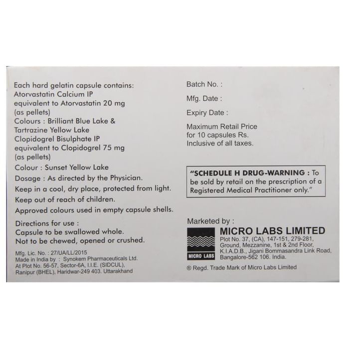 Marketer:Micro Labs Ltd,Composition:Atorvastatin (20mg) + Clopidogrel (75mg),medicine_type:,