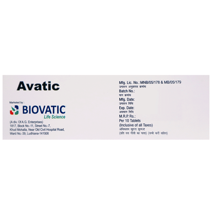 Manufacturer details:                                        Marketer details:Biovatic Lifescience | 1817, STREET NO.7, KHUDH MOHALLA, OPP.CMC HOSPITAL, LUDHIANA, PUNJAB-141002 , INDIA,,                                                Description:Avatic Tablet DT belongs to a group of medicines called antihistamines. It is used to treat various allergic conditions such as hay fever, conjunctivitis and some skin reactions, and reactions to bites and stings. It relieves watery eyes, runny nose, sneezing, and itching. Avatic Tablet DT can be taken with or without food. The dose required for you may vary depending on what you are taking it for. This medicine is usually taken in the evening but follow the advice of your doctor on how to take it. You may need this medicine only on days you have symptoms, but if you are taking it to prevent symptoms you should take it regularly. If you miss doses or stop taking it earlier than advised, your symptoms may come back.This medicine is generally very safe. The most common side effects include feeling sleepiness, dizziness, tiredness, and sore throat. These are usually mild and go away after a couple of days as your body adjusts. Consult your doctor if any of the side effects persist or worry you. You should avoid alcohol while taking this medicine.Before taking it, tell your doctor if you have any kidney problems or epilepsy. Your dose may need to be modified or this medicine may not be suitable. Some other medicines can interact with this medicine so let your healthcare team know what else you are taking. You should also talk to your doctor before using this medicine if you are pregnant or breastfeeding, although it is not thought to be harmful.