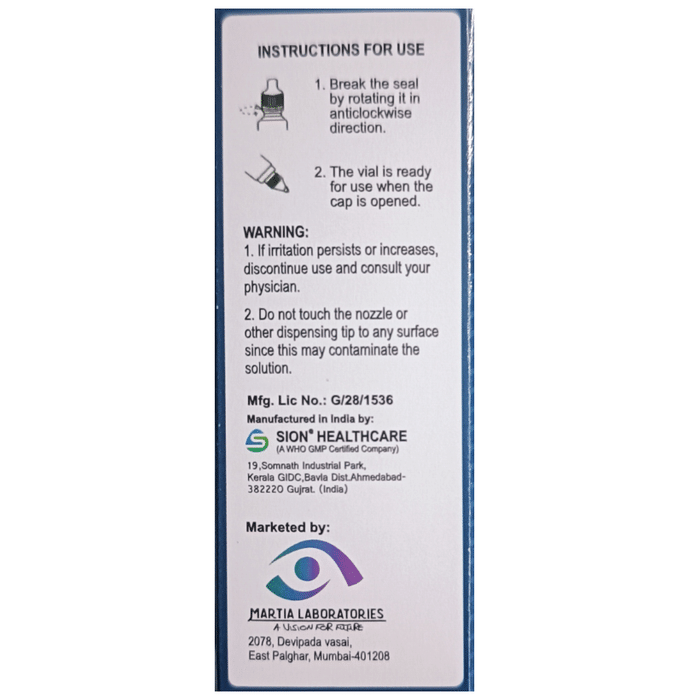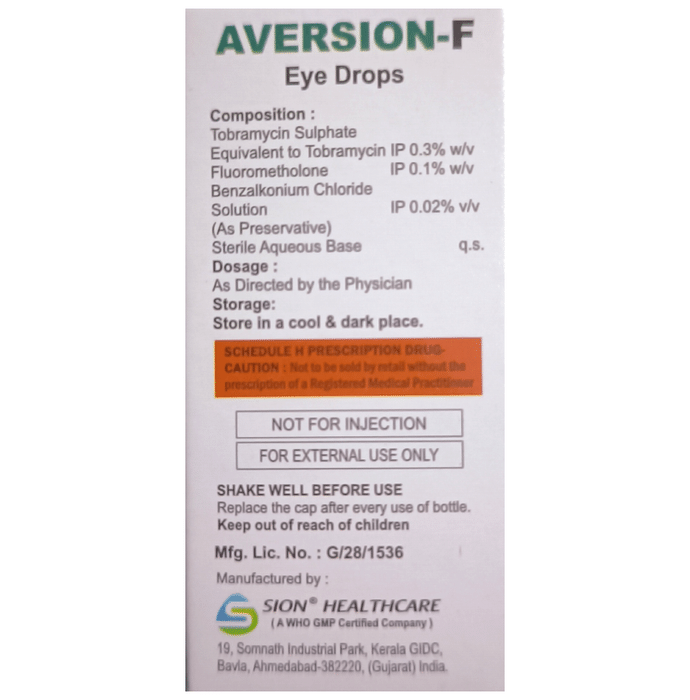 Manufacturer details:                                        Marketer details:Martia Laboratories | 2078,DEVIPADA VASAI,EAST PALGHAR,MUMBI-401208,                                                Description:Aversion-F Eye Drop is a medicine used to treat bacterial eye infections. It kills and prevents the growth of infection-causing bacteria. This way it relieves the symptoms and speeds up the healing process. Aversion-F Eye Drop is to be used only in the affected eye. Read the label carefully for instruction before you use the medicine. Use it in the exact dose and duration as advised by the doctor or as instructed in the label. Wash your hands before using this medicine. Complete your dose even if you feel better. Stopping the medicine too early may bring back the infection.Use of this medicine may cause burning, irritation, itching, and redness at the site of application. These are usually temporary and resolve with time. However, if they persist or get worse, inform your doctor. In case of accidental contact with your ears, nose, or mouth, immediately rinse it with water.Inform your doctor if you have a known allergy to any of the ingredients in this medicine or if you are taking any other medication. It is advised not to drive or operate heavy machinery immediately after using this medicine as it may cause temporary blurring of vision and may affect your ability to drive.