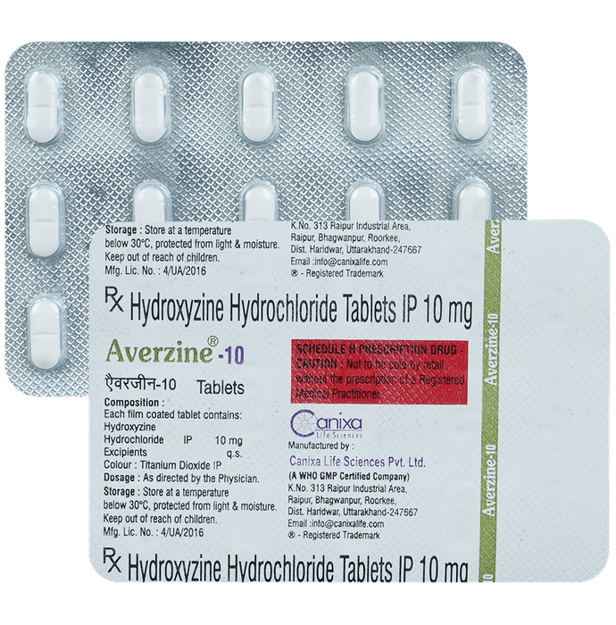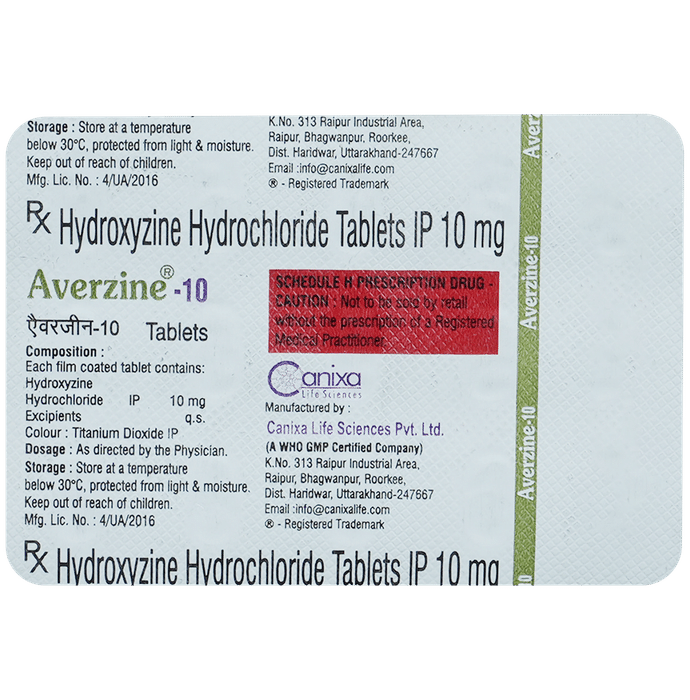 Manufacturer details:                                        Marketer details:Canixa Life Sciences Pvt Ltd | K. No. 312 & 313, Raipur Industrial Area, Bhagawanpur Roorkee, Dist. Haridwar, Uttarakhand,                                                Description:Averzine 10 Tablet is used to treat anxiety and helps to get relaxed before or after surgery. It is also used to treat symptoms of skin allergy like itching, swelling, and rashes in conditions such as eczema, dermatitis, and psoriasis. Averzine 10 Tablet should be taken with or without food. Take it exactly as your doctor has prescribed. The dose and how often you take it depends on what you are taking it for. Your doctor will decide how much you need to improve your symptoms. Take it for as long as it is prescribed for you. In case, you have missed any doses, take the next dose as soon as you remember it. However, you should never take a double dose.The most common side effects of this medicine include sedation, nausea, vomiting, stomach upset, and constipation. If these bother you or appear serious, let your doctor know. There may be ways of reducing or preventing them. You must avoid driving or attention-seeking activity while on treatment.Before taking this medicine, let your doctor know if you have heart problems or have high blood pressure, have liver or kidney problems. Inform your doctor if you are pregnant, or breastfeeding. Your doctor should also know about all other medicines you are taking as many of these may make this medicine less effective or change the way it works. Generally, it is advised to avoid alcohol while on treatment.