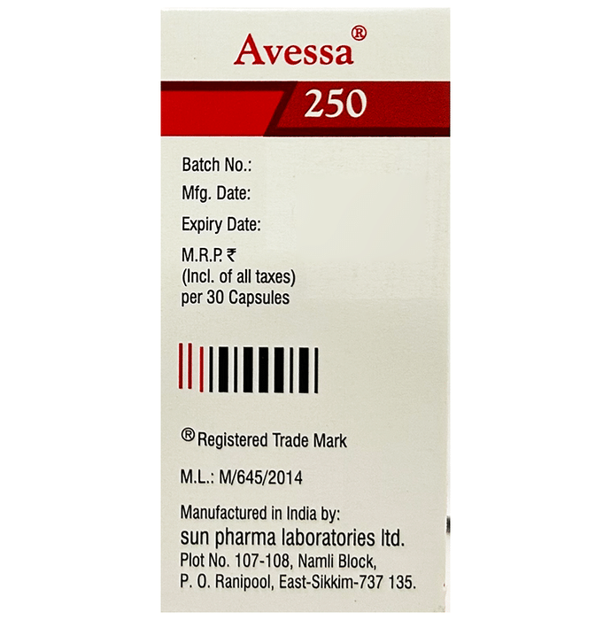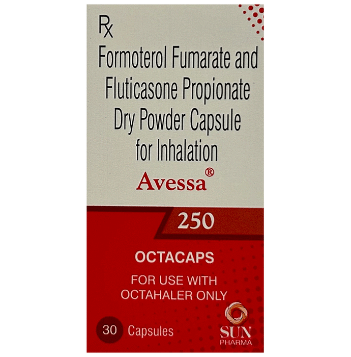 Manufacturer details:                                        Marketer details:Sun Pharmaceutical Industries Ltd | Plot no 107/108,Namli block , Ranipool, East Sikkim 737135,                                                Description:Avessa 250 Octacaps is used in the treatment of asthma (wheezing and shortness of breath) and chronic obstructive pulmonary disorder (a lung disorder in which the flow of air to the lungs is blocked). It relaxes the muscles of the air passages and making it easier to breathe. Your doctor will tell you how often you need to use your inhaler. It’s important that you take the lowest dose needed to effectively control your asthma. The effect of this medicine may be noticeable after a few days but will only reach its maximum after a few weeks. This medicine must be used regularly to be effective, so go on taking it even if you don’t have any symptoms. That means it’s doing its job. If you stop taking it your asthma and COPD may get worse. It should not be used to relieve sudden asthma attacks. If an asthma attack occurs, use your quick-relief inhaler (reliever). To get the benefit from this medicine you need to make sure you get your inhaler technique right, otherwise, it Does not work as well.The most common side effects are nausea, vomiting, respiratory tract infection, headache, hoarseness of voice, sore throat, cough, musculoskeletal (bone, muscle or joint) pain, and increased heart rate. If you get there, don’t stop taking it but do talk to your doctor. You can help prevent some of these symptoms by rinsing your mouth and throat with water or brushing your teeth after using your inhaler. There are other, rarer side effects which can be serious. Talk to your doctor if you’re worried about them. In general, you should be trying to avoid situations that make your asthma worse (your triggers) and try not to smoke.Ask your doctor whether it’s safe to take this medicine if you’re pregnant or breastfeeding. Before taking it, you should tell your doctor if you have any kidney or liver diseases so that your doctor can prescribe a suitable dose for you.