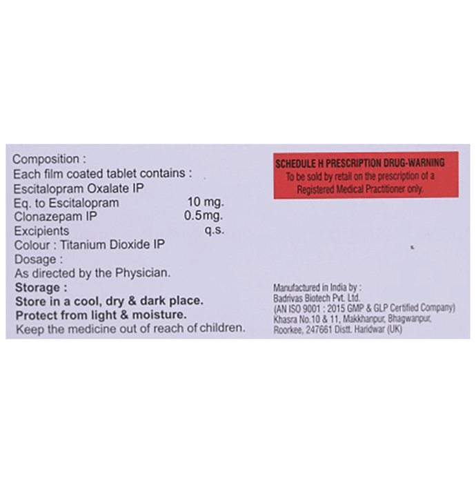 Marketer:Aviana Formulation Pvt Ltd,Composition:Clonazepam (0.5mg) + Escitalopram Oxalate (10mg),medicine_type:,
