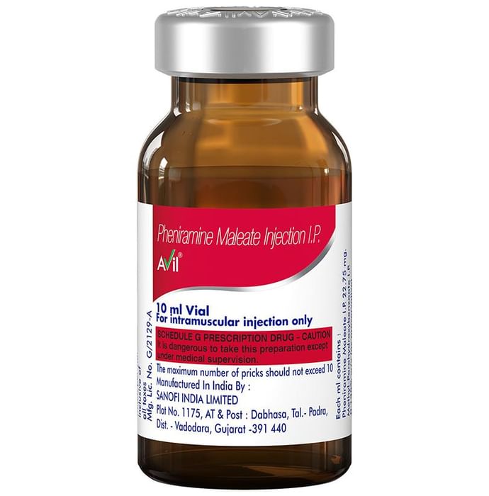 Manufacturer details:                                                                                Marketer details:Sanofi India Ltd | Sanofi House, CTS No.117-B, L&T Business Park, Saki Vihar Road, Powai, Mumbai 400072,                                                                                                Description:Avil Injection is an antihistamine used to treat allergic conditions (such as hay fever, drug rashes, allergic conjunctivitis, food allergy, etc.), respiratory tract conditions, and other skin conditions. It effectively reduces the severity, duration, and occurrence of symptoms and provides quick relief.Avil Injection is also used to treat and prevent motion sickness, symptoms of Meniere’s disease (such as nausea, vomiting and vertigo), and other associated labyrinthine disturbances.It is given as an injection into veins or muscles under the supervision of a doctor. It should be used as per the instruction of your doctor. The dose and how often you take it depends on what you are taking it for. Your doctor will decide how much you need to improve your symptoms. You should take Avil Injection for as long as it is prescribed for you.Sedation is the most common side effect of Avil Injection. Avoid driving or attention-seeking activities. If these bother you or appear serious, let your doctor know. There may be ways of reducing or preventing them. In some cases, it may cause dry mouth, so it is advised to drink more water, always carry sugar candy, or maintain oral hygiene.Before taking this medicine, let your doctor know if you have glaucoma, asthma, or high blood pressure. Inform your doctor if you are pregnant, or breastfeeding. Your doctor should also know about all other medicines you are taking as many of these may make this medicine less effective or change the way it works. Generally, it is advised to avoid alcohol while on treatment with Avil Injection.