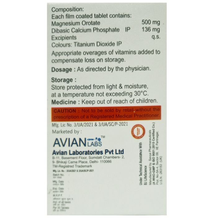 Marketer:Avian Laboratories,Composition:Dibasic Calcium Phosphate (136mg) + Magnesium Orotate (500mg),medicine_type:,