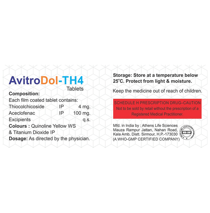 Manufacturer details: Marketer details:Avitron Pharma Pvt Ltd | Office No.128, First Floor, Fusion Park, Ajmera Road, Pimpri, Pune-411018, Description:Avitrodol-TH 4 Tablet is a combination medicine used in the treatment of pain due to muscle spasms. It improves the movement of muscles and provides relief from pain and discomfort associated with muscle spasms. Avitrodol-TH 4 Tablet should be taken with food. This will prevent you from getting an upset stomach. You should take it regularly as advised by your doctor. Do not take more or use it for a longer duration than recommended by your doctor.Some of the common side effects of this medicine include nausea, vomiting, heartburn, stomach pain, loss of appetite, and diarrhea. If any of these side effects bother you or do not go away with time, you should let your doctor know. Your doctor may help with ways to reduce or prevent these side effects.The medicine may not be suitable for everybody. Before taking it, let your doctor know if you have any problems with your heart, kidneys, and liver. To make sure it is safe for you, let your doctor also know all the other medicines you are taking. Pregnant and breastfeeding mothers should first consult their doctors before using the medicine.