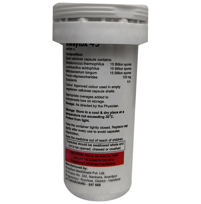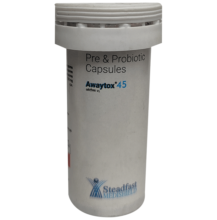 Awaytox 45 Capsule is a pre-probiotic combination that is used to treat chronic kidney disease. It metabolizes various nitrogenous wastes that diffuse from the bloodstream into the bowel and promotes healthy gut flora. This way it reduces the uremic toxins in renal-impaired patients. Take Awaytox 45 Capsule in the dose and duration as prescribed by your doctor as taking more than the recommended dose may cause undesirable side effects. Also, it is advised to take this medicine at a fixed time to avoid missing a dose.Generally, Awaytox 45 Capsule has little or no side effects. However, some people may experience gas or flatulence. These effects usually disappear after 2 to 3 weeks of continuous usage, but if they persist or get worse, consult with your doctor.To make sure that Awaytox 45 Capsule is safe for you, let your doctor know if you have any other health conditions. Inform them if you are taking any other medicines or are pregnant or breastfeeding.