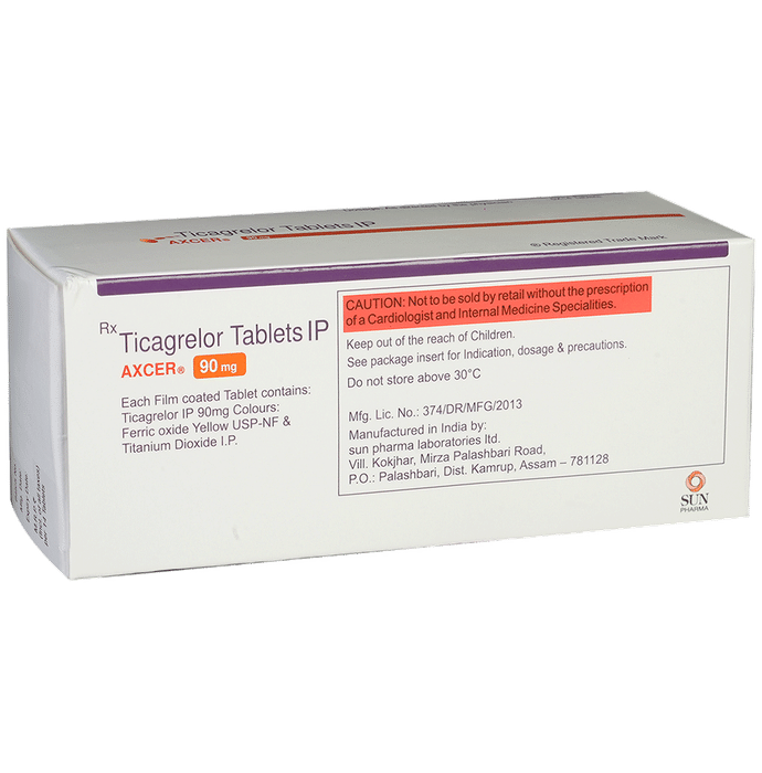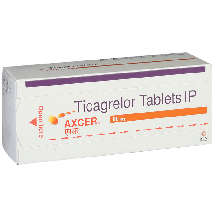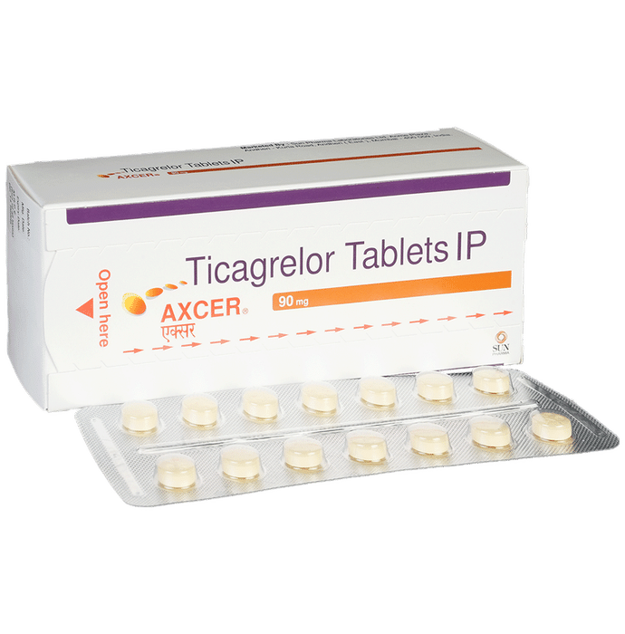 description:Axcer 90mg Tablet belongs to a group of medicines called antiplatelet or blood thinners. It reduces the formation of harmful blood clots in blood vessels, which helps to prevent heart attacks or strokes in people with heart disease. Axcer 90mg Tablet is also used to treat people with a recent heart attack or severe heart-related chest pain (unstable angina) who have undergone stenting of the heart. It helps to prevent serious heart-related problems like having another heart attack, stroke, or formation of blood clots in stents in such people.Your doctor will also prescribe aspirin, another antiplatelet medicine, along with this medicine. Axcer 90mg Tablet may be taken with or without food and should be taken regularly at the same time each day. It is important to keep taking it even if you feel well. If you stop taking this medicine, it may increase your chances of having another heart attack or stroke.The most common side effects of this medicine are dyspnea (breathlessness) and bleeding. If you cut or injure yourself, it may take longer than usual for the bleeding to stop. Such episodes of bleeding are usually mild and resolve on their own. Mild breathlessness caused by this medicine usually resolves on its own with continued treatment. Let your doctor know if bleeding persists or if the breathlessness worsens or does not go away.Axcer 90mg Tablet is not suitable for some people. Do not take it if you are bleeding from anywhere in the body, such as a stomach ulcer or bleeding within the brain. It is also not recommended for people with liver diseases. Before using the medicine, inform your doctor of any such problems.
