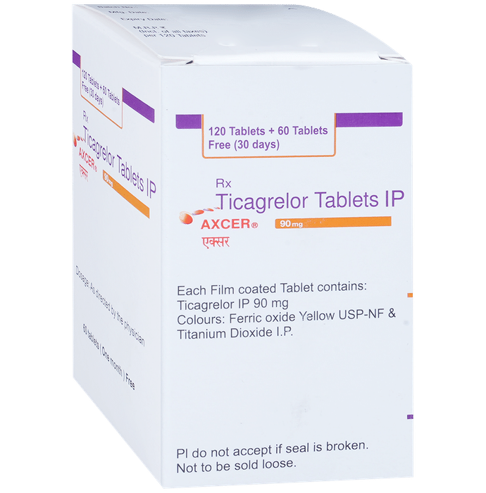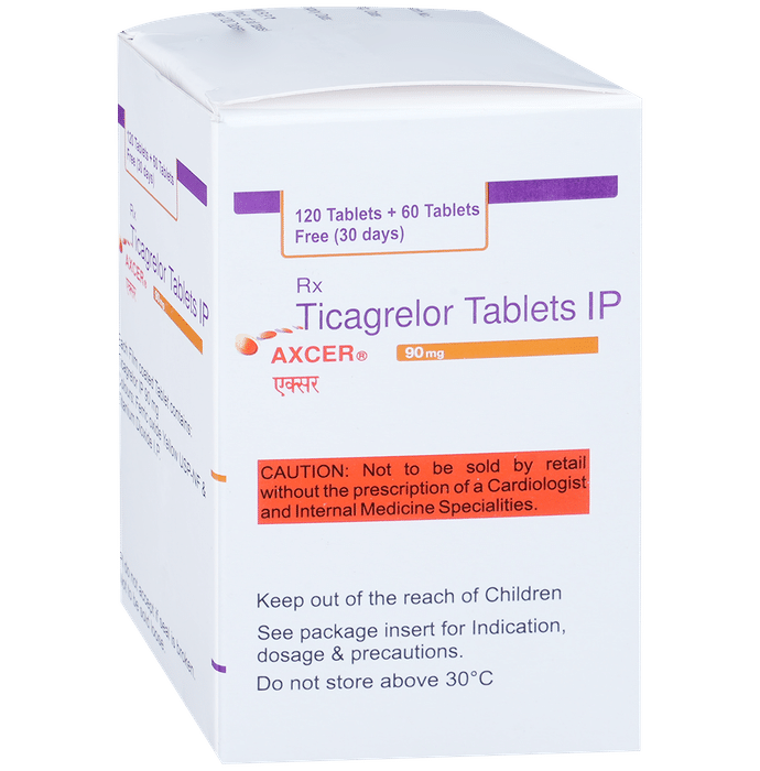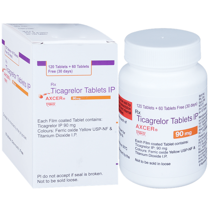 description:Axcer 90mg Tablet belongs to a group of medicines called antiplatelet or blood thinners. It reduces the formation of harmful blood clots in blood vessels, which helps to prevent heart attacks or strokes in people with heart disease. Axcer 90mg Tablet is also used to treat people with a recent heart attack or severe heart-related chest pain (unstable angina) who have undergone stenting of the heart. It helps to prevent serious heart-related problems like having another heart attack, stroke, or formation of blood clots in stents in such people.Your doctor will also prescribe aspirin, another antiplatelet medicine, along with this medicine. Axcer 90mg Tablet may be taken with or without food and should be taken regularly at the same time each day. It is important to keep taking it even if you feel well. If you stop taking this medicine, it may increase your chances of having another heart attack or stroke.The most common side effects of this medicine are dyspnea (breathlessness) and bleeding. If you cut or injure yourself, it may take longer than usual for the bleeding to stop. Such episodes of bleeding are usually mild and resolve on their own. Mild breathlessness caused by this medicine usually resolves on its own with continued treatment. Let your doctor know if bleeding persists or if the breathlessness worsens or does not go away.Axcer 90mg Tablet is not suitable for some people. Do not take it if you are bleeding from anywhere in the body, such as a stomach ulcer or bleeding within the brain. It is also not recommended for people with liver diseases. Before using the medicine, inform your doctor of any such problems.