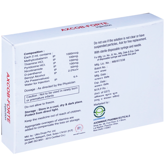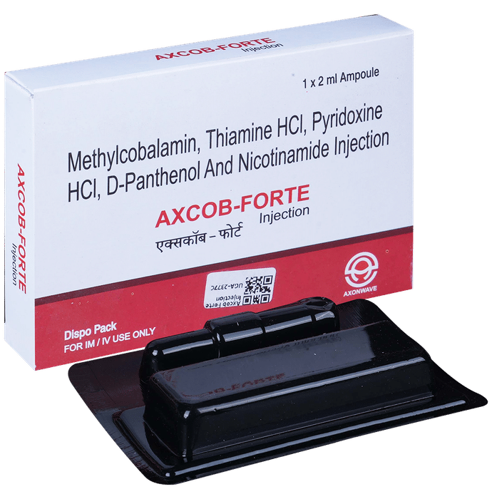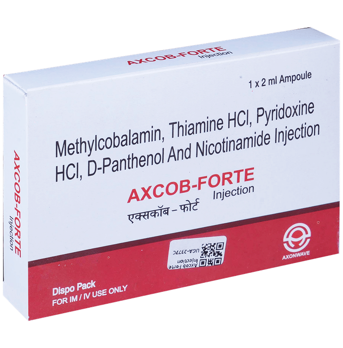 description:Axcob Forte Injection is a prescription medicine. It has a combination of vitamins that is prescribed to treat vitamin and other nutritional deficiencies. It ensures the proper growth and functioning of the body. Axcob Forte Injection injection is administered under the supervision of a healthcare professional. You are not advised to self administer this injection. Inform your doctor if you have any known allergy from this medication.You may experience symptoms of injection site reactions such as redness, swelling and pain. Usually they go away with time but if these symptoms persist for a longer duration, please consult your doctor. Inform your doctor if you are suffering from any disease or are taking any medicines.
