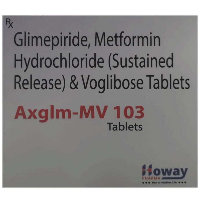 description:Axglm-MV 103 Tablet SR belongs to a category of medicines known as anti-diabetic drugs. It is a combination of medicines used to treat type 2 diabetes mellitus in adults. It helps control blood sugar levels in people with diabetes.Axglm-MV 103 Tablet SR should be taken with food. Take it regularly at the same time each day to get the most benefit. Your doctor will decide what dose is best for you and this may change from time to time according to how it is working according to your blood sugar levels.Keep taking this medicine, even if you feel well or your blood sugar levels are controlled. If you stop it without consulting your doctor, your blood sugar levels could rise and put you at risk of kidney damage, blindness, nerve problems and loss of limbs. Remember that it is only part of a treatment program that should also include a healthy diet, regular exercise, and weight reduction as advised by your doctor. Your lifestyle plays a big part in controlling diabetes.The most common side effect of Axglm-MV 103 Tablet SR is low blood glucose levels (hypoglycemia). Make sure you recognize the signs of having low blood glucose levels, such as sweating, dizziness, headache, and shaking and know how to deal with it. To prevent this, it’s important to have regular meals and always carry a fast-acting source of glucose such as sugary food or fruit juice with you. Drinking alcohol can also increase your risk of low blood sugar levels and should be avoided. Other side effects that may be seen on taking this medicine include taste changes, nausea, diarrhea, stomach pain, headache, edema (swelling), blurred vision, bone fracture, and upper respiratory tract infection. Some people may find that they put on weight with this medicine.You should not take it if you have type 1 diabetes mellitus, if you have diabetic ketoacidosis (high levels of acid in your blood), or if you have severe kidney or liver disease. Before taking this medicine, tell your doctor if you have ever had heart disease. It may not be suitable. Pregnant or breastfeeding women should also consult their doctor before taking it. Your blood sugar levels should be checked regularly and your doctor may also advise blood tests to monitor your blood cell counts and liver function.