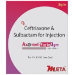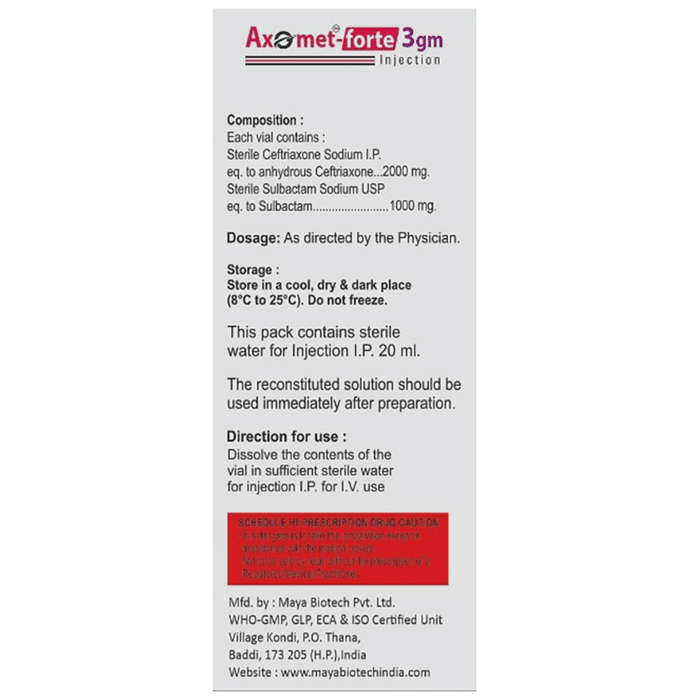 description:Axomet-Forte 3gm Injection is a combination medicine. It is prescribed to treat various types of bacterial infections. It fights against the microorganisms to prevent their growth and further spread of the infection. Axomet-Forte 3gm Injection should only be administered under the supervision of a healthcare professional. Do not miss any scheduled appointments for taking this medicine. The course of the treatment must be completed even if you feel better. Sudden discontinuation of the treatment may affect the potency of the medicine.Some common side effects of this medicine are nausea, vomiting, diarrhea, indigestion, etc. If any of the side effects get aggravated, you must consult your doctor immediately. If you experience any allergic reaction (rashes, itching, swelling, shortness of breath, etc.), you must seek immediate medical help.Before taking this medicine, you should tell your doctor if you are taking any medicines for any health condition. Pregnant or breastfeeding women should also consult with their doctor before taking it. Avoid drinking alcohol as it can cause excessive drowsiness with this medicine. It usually does not impair your ability to drive, but you should not drive if it makes you feel sleepy or dizzy. You must take adequate rest for a faster recovery, also take a healthy diet and drink plenty of water. Your doctor may ask for a few laboratory and diagnostic tests to know the effects of the medicine on your body.