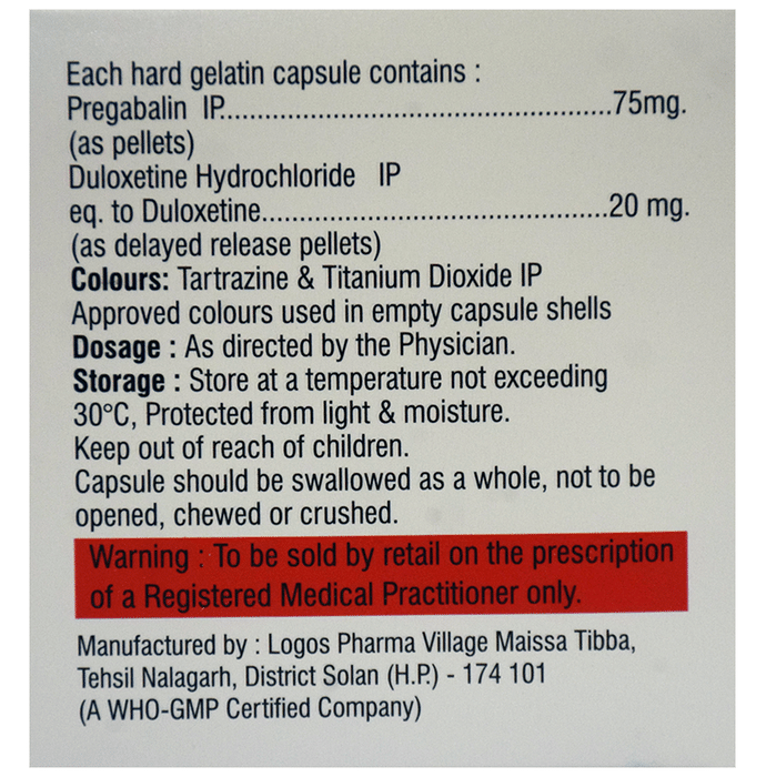 Marketer:Gonan Pharma,Composition:Pregabalin (75mg) + Duloxetine (20mg),                       medicine_type:drugs,