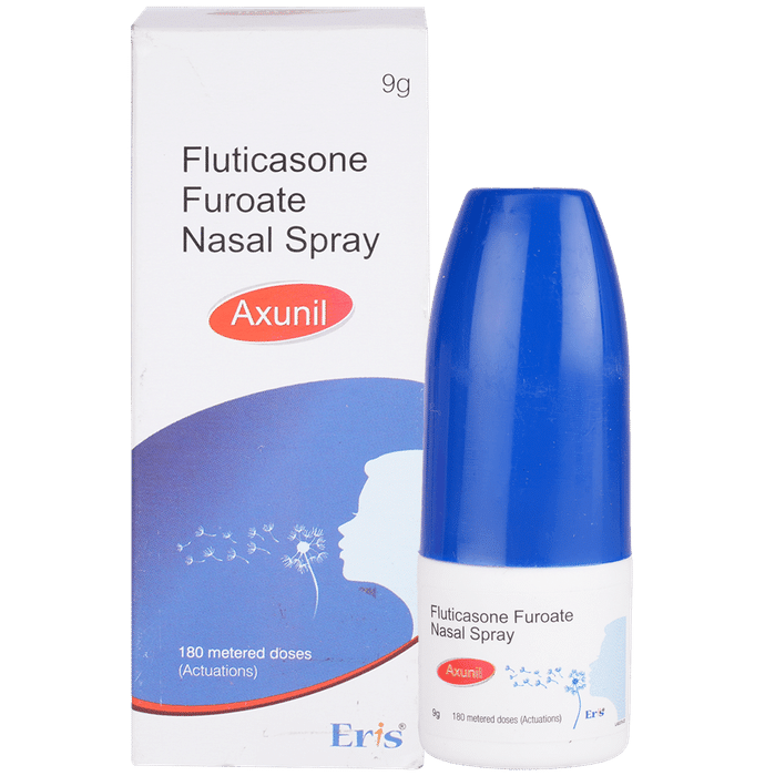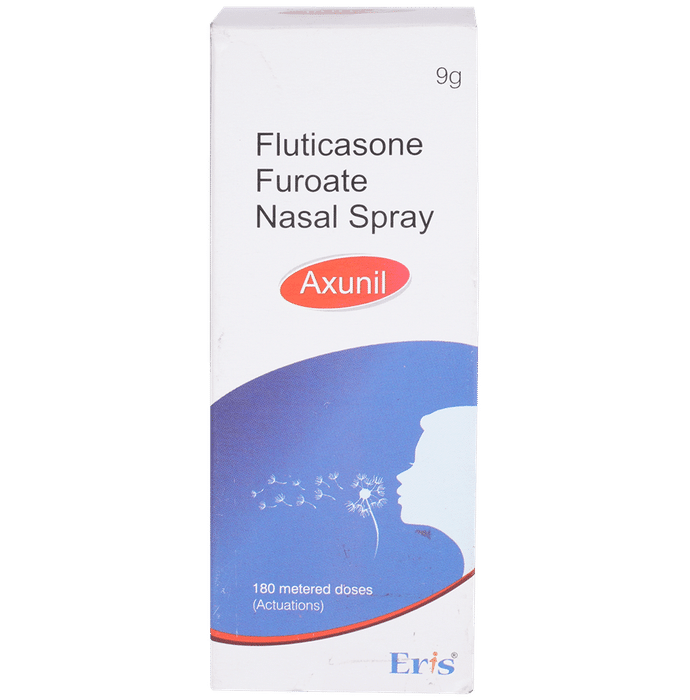 description:Axunil Nasal Spray is a steroid. It relieves the symptoms of rhinitis (blocked nose) such as runny nose, sneezing, and sinus discomfort. It works by blocking the production of certain chemical messengers that cause inflammation (swelling) and allergies, thus relieving the discomfort and irritation in your nose.You should always use Axunil Nasal Spray as advised by your doctor. To get the full benefit of the medicine you should use it regularly. Normally, you should blow your nose gently before using it, keep one nostril closed while applying the medicine into the other, and then sniff hard to make sure it reaches deep into the nose. Then repeat for the other nostril.Nasal irritation is a very common side effect of this medicine. It may also cause nosebleed and headaches in some patients. Talk to your doctor if you are worried about side effects or they do not go away. Using corticosteroids like this medicine makes you more susceptible to viral infections, so you should stay away from people who have these infections. In general, you should try to avoid situations which make your symptoms worse (things like pollen and dust mites) and it’s best not to smoke.Before using this medicine, you should let your doctor know if you are pregnant or breastfeeding. It is important to discuss the risks and benefits with your doctor. If you use this medicine for a long time, your doctor may want to carry out certain medical tests to check your progress.