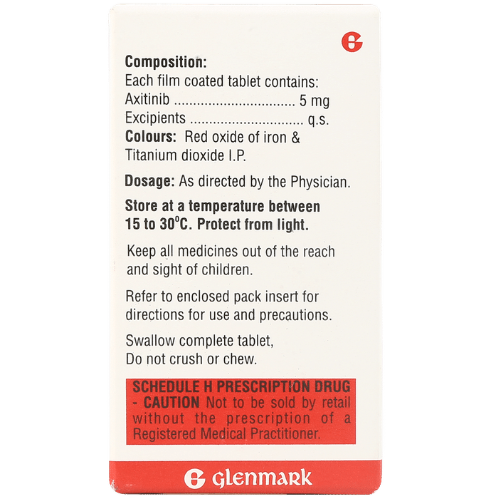 Marketer:Glenmark Pharmaceuticals Ltd,Composition:Axitinib (5mg),                       medicine_type:drugs,