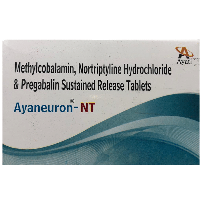description:Ayaneuaron-NT Tablet SR is a combination medicine used to treat neuropathic pain. It works by decreasing pain by controlling calcium channel activity of the nerve cells. It also increases the level of chemical messengers in the brain that help in regulating the mood and protect nerve fibers. Ayaneuaron-NT Tablet SR can be taken with or without food. However, it is advised to take it at the same time each day as this helps to maintain a consistent level of medicine in the body. Take this medicine in the dose and duration advised by the doctor. If you miss a dose of this medicine, take it as soon as you remember. Finish the full course of the treatment even if you feel better. It is important not to stop taking this medicine suddenly as it may worsen your symptoms.Some common side effects of this medicine include constipation, weight gain, and dryness in mouth. It may cause dizziness and sleepiness, so do not drive or do anything that requires mental focus until you know how this medicine affects you. This medicine may cause weight gain and to control it, you should have a balanced diet and exercise regularly. You must inform your doctor if you develop any unusual changes in mood or behavior, new or worsening depression, or suicidal thoughts.Before taking this medicine let your doctor know if you suffer from kidney or liver disease. Your doctor should also know about all other medicines you are taking as many of these may make this medicine less effective or change the way it works. Inform your doctor if you are pregnant, planning pregnancy or breastfeeding.