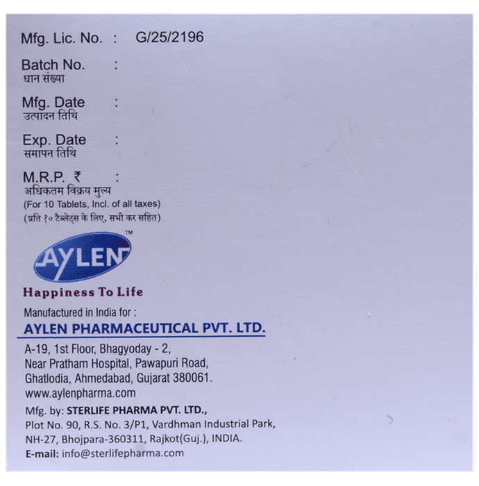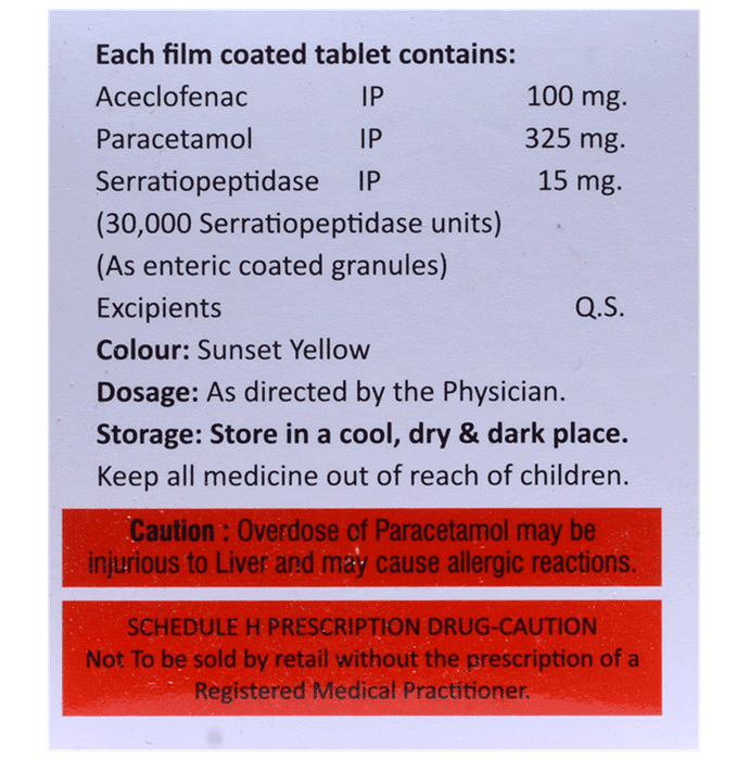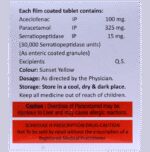 Marketer:Aylen Pharmaceutical Pvt. Ltd.,Composition:Aceclofenac (100mg) + Paracetamol (325mg) + Serratiopeptidase (15mg),                       medicine_type:drugs,