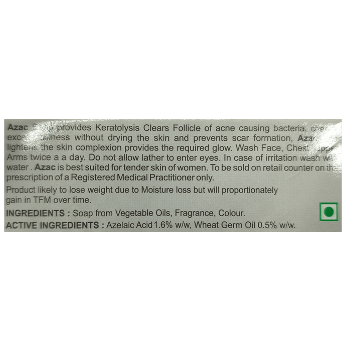 description:Azac Soap is used in the treatment of acne (pimples). It effectively relieves symptoms such as lumps, redness, and swelling associated with different forms of acne. It works by killing acne-causing bacteria. Azac Soap is for external use only. You should always use it exactly as prescribed. Both the affected area and your hands should be clean and dry before application. Use this medicine regularly to get the most benefit from it. Do not use more than you need as it will not clear your condition faster and some side effects may be increased. If your condition goes on for longer than four weeks or gets worse at any time, let your doctor know. You can help this medication work better by keeping the affected areas clean.Azac Soap has a few potential side effects but not everyone will get them. These include application site reactions like burning, irritation, itching, and redness. Let your doctor know if you’re bothered by these or they do not go away. Avoid getting the medicine in your eye. In case of accidental contact, rinse thoroughly with water.If you are pregnant, breastfeeding, or plan to become pregnant, you should consult your doctor before using this medicine.