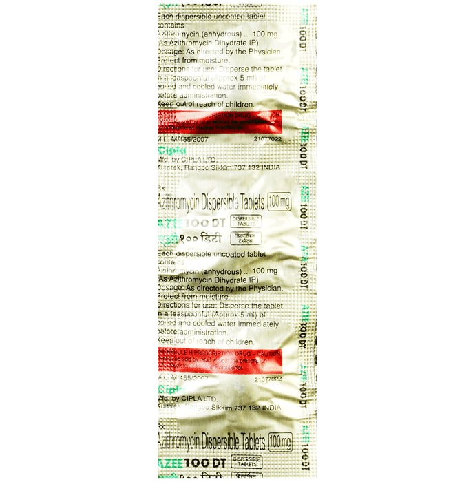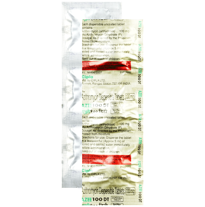 description:Azee 100mg Tablet DT is an antibiotic medication. It is commonly given to children for the treatment of a wide range of bacterial infections targeting the ear, eyes, nose, throat, lungs, skin, and gastrointestinal tract. Azee 100mg Tablet DT works by inhibiting the growth of the infection-causing bacteria and stopping it from multiplying. As a result of this, the spread of the infection is disabled. Azee 100mg Tablet DT is usually given once a day, preferably in the morning. However, in the case of typhoid, it is to be given twice. Give it with or without food at about the same time each day. However, it is best given with food since children often have a sensitive stomach and could easily get a stomach upset.Medicine dose depends on the type of infection your child has, its severity, and your child’s age and body weight. So stick to the dose, time, and way prescribed by the doctor. In case your child vomits within 30 minutes of taking this medicine, give the same dose again.Your child may start to feel better within 3 to 5  days of regular dosing. However, you must still complete the full prescribed course of the medicine and never stop it abruptly as that may worsen your child’s condition or increase the risk of reinfection. Some of the minor and temporary side effects of this medicine include vomiting, diarrhea, nausea, and stomach pain. Usually, these episodes subside once your child’s body adapts to the medicine. However, in case these effects persist or become bothersome for your child, consult your child’s doctor without any delay.Inform your child’s doctor about any previous episode of any allergy, heart problem, liver impairment, and kidney malfunction. Knowing the child’s medical history is critical for dose alterations and for planning your child’s overall treatment.