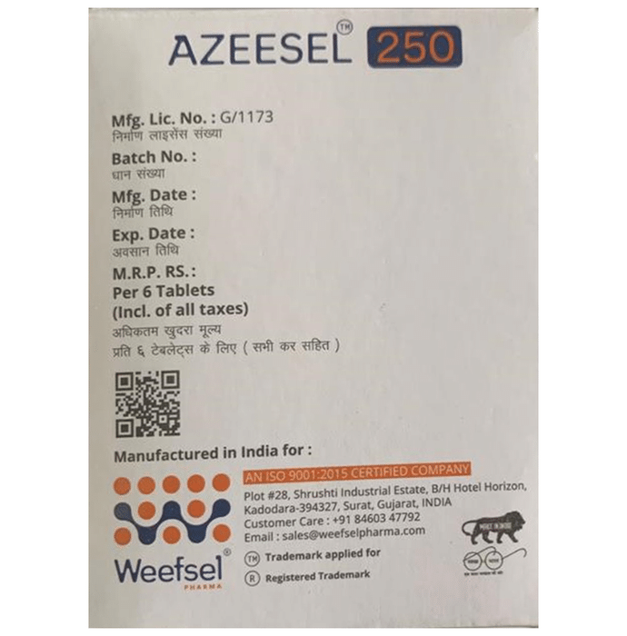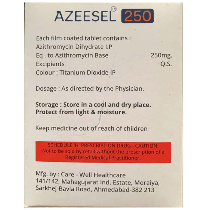 description:Azeesel 250 Tablet is an antibiotic used to treat various types of bacterial infections of the respiratory tract, ear, nose, throat, lungs, skin, and eye in adults and children. It is also effective in typhoid fever and some sexually transmitted diseases like gonorrhea. Azeesel 250 Tablet is taken orally, preferably one hour before or 2 hours after a meal. It should be used regularly at evenly spaced time intervals as prescribed by your doctor. Do not skip any doses and finish the full course of treatment even if you feel better. Stopping the medicine too early may lead to the return or worsening of the infection.Commonly seen side effects seen with this medicine include vomiting, nausea, stomach pain, headache, and diarrhea. These are usually temporary and subside with the completion of treatment. Consult your doctor if you find these side effects worry you or persist for a longer duration.Do not use Azeesel 250 Tablet if you have a history of cholestatic jaundice or hepatic dysfunction that happened with the use of azithromycin. Inform your doctor if you have any previous history of allergy or heart problems before taking this medicine. Pregnant or breastfeeding women should consult their doctor before using this medicine.
