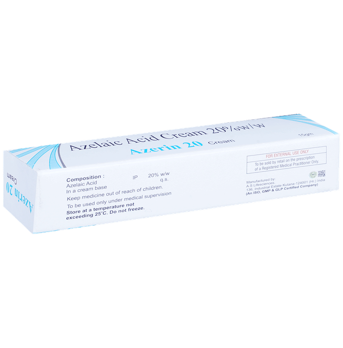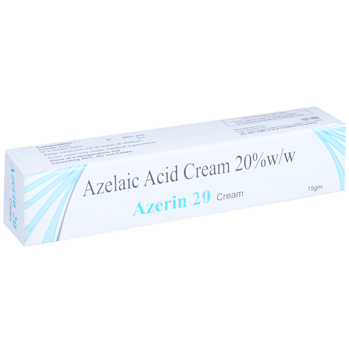 description:Azerin 20% Cream is used in the treatment of acne (pimples). It effectively relieves symptoms such as lumps, redness, and swelling associated with different forms of acne. It works by killing acne-causing bacteria. Azerin 20% Cream is for external use only. You should always use it exactly as prescribed. Both the affected area and your hands should be clean and dry before application. Use this medicine regularly to get the most benefit from it. Do not use more than you need as it will not clear your condition faster and some side effects may be increased. If your condition goes on for longer than four weeks or gets worse at any time, let your doctor know. You can help this medication work better by keeping the affected areas clean.Azerin 20% Cream has a few potential side effects but not everyone will get them. These include application site reactions like burning, irritation, itching, and redness. Let your doctor know if you’re bothered by these or they do not go away. Avoid getting the medicine in your eye. In case of accidental contact, rinse thoroughly with water.If you are pregnant, breastfeeding, or plan to become pregnant, you should consult your doctor before using this medicine.