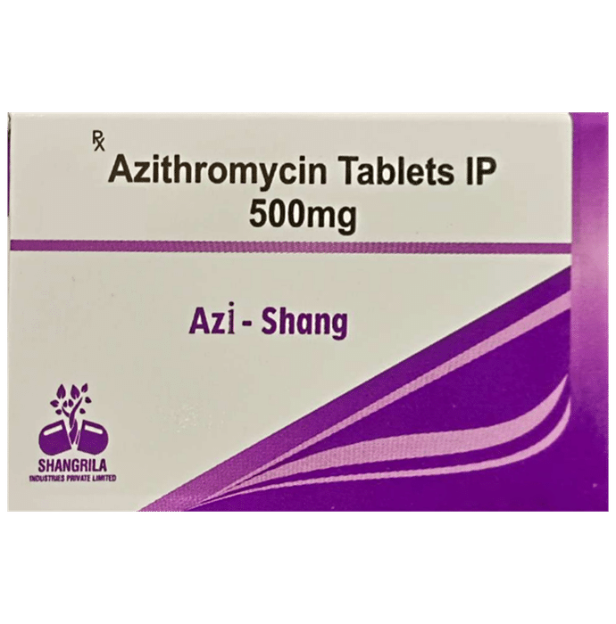 description:Azi-Shang Tablet is an antibiotic used to treat various types of bacterial infections of the respiratory tract, ear, nose, throat, lungs, skin, and eye in adults and children. It is also effective in typhoid fever and some sexually transmitted diseases like gonorrhea. Azi-Shang Tablet is taken orally, preferably one hour before or 2 hours after a meal. It should be used regularly at evenly spaced time intervals as prescribed by your doctor. Do not skip any doses and finish the full course of treatment even if you feel better. Stopping the medicine too early may lead to the return or worsening of the infection.Commonly seen side effects seen with this medicine include vomiting, nausea, stomach pain, headache, and diarrhea. These are usually temporary and subside with the completion of treatment. Consult your doctor if you find these side effects worry you or persist for a longer duration.Do not use Azi-Shang Tablet if you have a history of cholestatic jaundice or hepatic dysfunction that happened with the use of azithromycin. Inform your doctor if you have any previous history of allergy or heart problems before taking this medicine. Pregnant or breastfeeding women should consult their doctor before using this medicine.