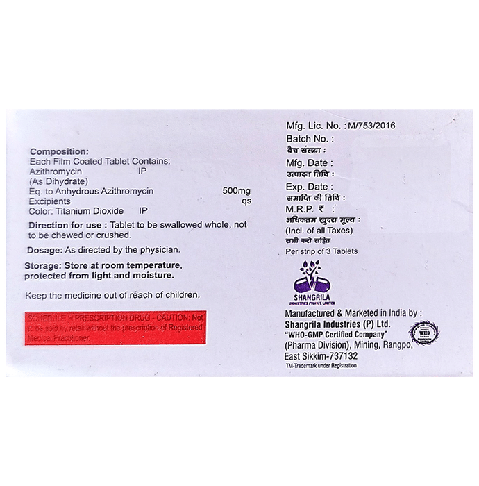 Marketer:Shangrila Industries (P) Ltd,Composition:Azithromycin (500mg),                       medicine_type:drugs,