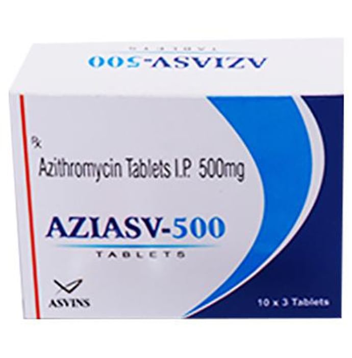 description:Aziasv 500 Tablet is an antibiotic used to treat various types of bacterial infections of the respiratory tract, ear, nose, throat, lungs, skin, and eye in adults and children. It is also effective in typhoid fever and some sexually transmitted diseases like gonorrhea. Aziasv 500 Tablet is taken orally, preferably one hour before or 2 hours after a meal. It should be used regularly at evenly spaced time intervals as prescribed by your doctor. Do not skip any doses and finish the full course of treatment even if you feel better. Stopping the medicine too early may lead to the return or worsening of the infection.Commonly seen side effects seen with this medicine include vomiting, nausea, stomach pain, headache, and diarrhea. These are usually temporary and subside with the completion of treatment. Consult your doctor if you find these side effects worry you or persist for a longer duration.Do not use Aziasv 500 Tablet if you have a history of cholestatic jaundice or hepatic dysfunction that happened with the use of azithromycin. Inform your doctor if you have any previous history of allergy or heart problems before taking this medicine. Pregnant or breastfeeding women should consult their doctor before using this medicine.