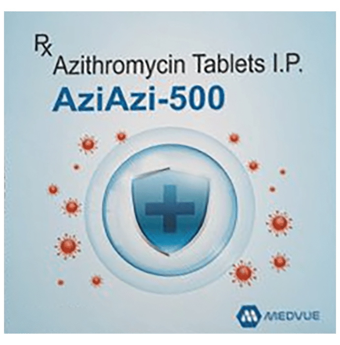 description:AziAzi 500 Tablet is an antibiotic used to treat various types of bacterial infections of the respiratory tract, ear, nose, throat, lungs, skin, and eye in adults and children. It is also effective in typhoid fever and some sexually transmitted diseases like gonorrhea. AziAzi 500 Tablet is taken orally, preferably one hour before or 2 hours after a meal. It should be used regularly at evenly spaced time intervals as prescribed by your doctor. Do not skip any doses and finish the full course of treatment even if you feel better. Stopping the medicine too early may lead to the return or worsening of the infection.Commonly seen side effects seen with this medicine include vomiting, nausea, stomach pain, headache, and diarrhea. These are usually temporary and subside with the completion of treatment. Consult your doctor if you find these side effects worry you or persist for a longer duration.Do not use AziAzi 500 Tablet if you have a history of cholestatic jaundice or hepatic dysfunction that happened with the use of azithromycin. Inform your doctor if you have any previous history of allergy or heart problems before taking this medicine. Pregnant or breastfeeding women should consult their doctor before using this medicine.