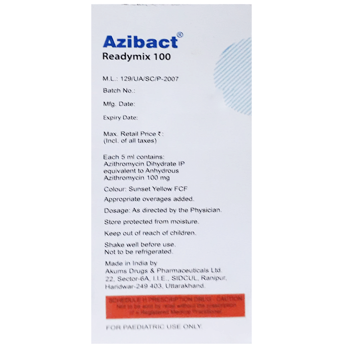 description:Azibact 100 Readymix Oral Suspension is an antibiotic medication. It is commonly given to children for the treatment of a wide range of bacterial infections targeting the ear, eyes, nose, throat, lungs, skin, and gastrointestinal tract. Azibact 100 Readymix Oral Suspension works by inhibiting the growth of the infection-causing bacteria and stopping it from multiplying. As a result of this, the spread of the infection is disabled. Azibact 100 Readymix Oral Suspension is usually given once a day, preferably in the morning. However, in the case of typhoid, it is to be given twice. Give it with or without food at about the same time each day. However, it is best given with food since children often have a sensitive stomach and could easily get a stomach upset.Medicine dose depends on the type of infection your child has, its severity, and your child’s age and body weight. So stick to the dose, time, and way prescribed by the doctor. In case your child vomits within 30 minutes of taking this medicine, give the same dose again.Your child may start to feel better within 2 days of regular dosing. However, you must still complete the full prescribed course of the medicine and never stop it abruptly as that may worsen your child’s condition or increase the risk of reinfection. Some of the minor and temporary side effects of this medicine include vomiting, diarrhea, nausea, and stomach pain. Usually, these episodes subside once your child’s body adapts to the medicine. However, in case these effects persist or become bothersome for your child, consult your child’s doctor without any delay.Inform your child’s doctor about any previous episode of any allergy, heart problem, liver impairment, and kidney malfunction. Knowing the child’s medical history is critical for dose alterations and for planning your child’s overall treatment.