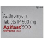 description:Azifast 500 Tablet is an antibiotic used to treat various types of bacterial infections of the respiratory tract, ear, nose, throat, lungs, skin, and eye in adults and children. It is also effective in typhoid fever and some sexually transmitted diseases like gonorrhea. Azifast 500 Tablet is taken orally, preferably one hour before or 2 hours after a meal. It should be used regularly at evenly spaced time intervals as prescribed by your doctor. Do not skip any doses and finish the full course of treatment even if you feel better. Stopping the medicine too early may lead to the return or worsening of the infection.Commonly seen side effects seen with this medicine include vomiting, nausea, stomach pain, headache, and diarrhea. These are usually temporary and subside with the completion of treatment. Consult your doctor if you find these side effects worry you or persist for a longer duration.Do not use Azifast 500 Tablet if you have a history of cholestatic jaundice or hepatic dysfunction that happened with the use of azithromycin. Inform your doctor if you have any previous history of allergy or heart problems before taking this medicine. Pregnant or breastfeeding women should consult their doctor before using this medicine.