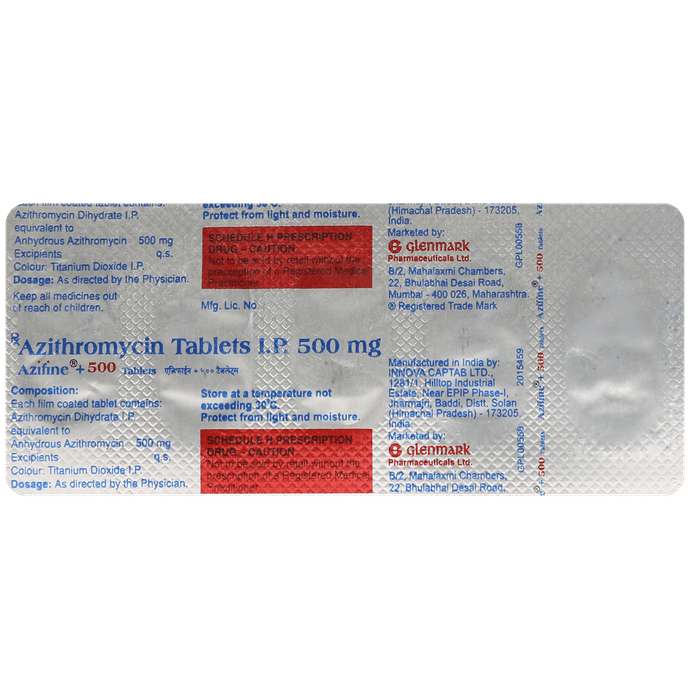 description:Azifine + 500 Tablet is an antibiotic used to treat various types of bacterial infections of the respiratory tract, ear, nose, throat, lungs, skin, and eye in adults and children. It is also effective in typhoid fever and some sexually transmitted diseases like gonorrhea. Azifine + 500 Tablet is taken orally, preferably one hour before or 2 hours after a meal. It should be used regularly at evenly spaced time intervals as prescribed by your doctor. Do not skip any doses and finish the full course of treatment even if you feel better. Stopping the medicine too early may lead to the return or worsening of the infection.Commonly seen side effects seen with this medicine include vomiting, nausea, stomach pain, headache, and diarrhea. These are usually temporary and subside with the completion of treatment. Consult your doctor if you find these side effects worry you or persist for a longer duration.Do not use Azifine + 500 Tablet if you have a history of cholestatic jaundice or hepatic dysfunction that happened with the use of azithromycin. Inform your doctor if you have any previous history of allergy or heart problems before taking this medicine. Pregnant or breastfeeding women should consult their doctor before using this medicine.