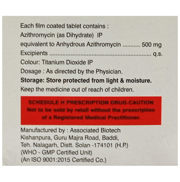 description:Aziplus 500 Tablet is an antibiotic used to treat various types of bacterial infections of the respiratory tract, ear, nose, throat, lungs, skin, and eye in adults and children. It is also effective in typhoid fever and some sexually transmitted diseases like gonorrhea. Aziplus 500 Tablet is taken orally, preferably one hour before or 2 hours after a meal. It should be used regularly at evenly spaced time intervals as prescribed by your doctor. Do not skip any doses and finish the full course of treatment even if you feel better. Stopping the medicine too early may lead to the return or worsening of the infection.Commonly seen side effects seen with this medicine include vomiting, nausea, stomach pain, headache, and diarrhea. These are usually temporary and subside with the completion of treatment. Consult your doctor if you find these side effects worry you or persist for a longer duration.Do not use Aziplus 500 Tablet if you have a history of cholestatic jaundice or hepatic dysfunction that happened with the use of azithromycin. Inform your doctor if you have any previous history of allergy or heart problems before taking this medicine. Pregnant or breastfeeding women should consult their doctor before using this medicine.