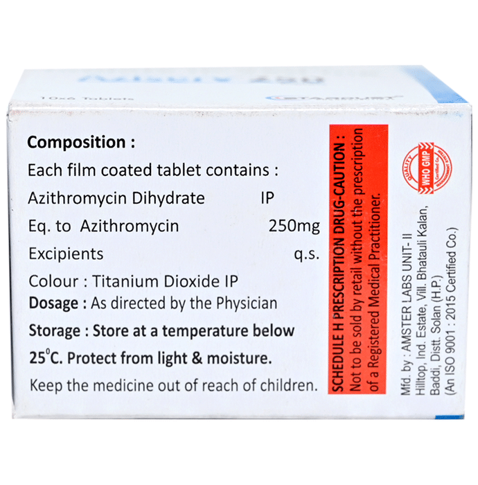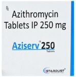 description:Aziserv 250 Tablet is an antibiotic used to treat various types of bacterial infections of the respiratory tract, ear, nose, throat, lungs, skin, and eye in adults and children. It is also effective in typhoid fever and some sexually transmitted diseases like gonorrhea. Aziserv 250 Tablet is taken orally, preferably one hour before or 2 hours after a meal. It should be used regularly at evenly spaced time intervals as prescribed by your doctor. Do not skip any doses and finish the full course of treatment even if you feel better. Stopping the medicine too early may lead to the return or worsening of the infection.Commonly seen side effects seen with this medicine include vomiting, nausea, stomach pain, headache, and diarrhea. These are usually temporary and subside with the completion of treatment. Consult your doctor if you find these side effects worry you or persist for a longer duration.Do not use Aziserv 250 Tablet if you have a history of cholestatic jaundice or hepatic dysfunction that happened with the use of azithromycin. Inform your doctor if you have any previous history of allergy or heart problems before taking this medicine. Pregnant or breastfeeding women should consult their doctor before using this medicine.