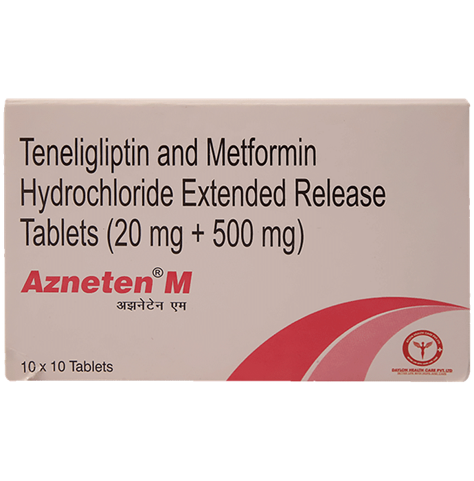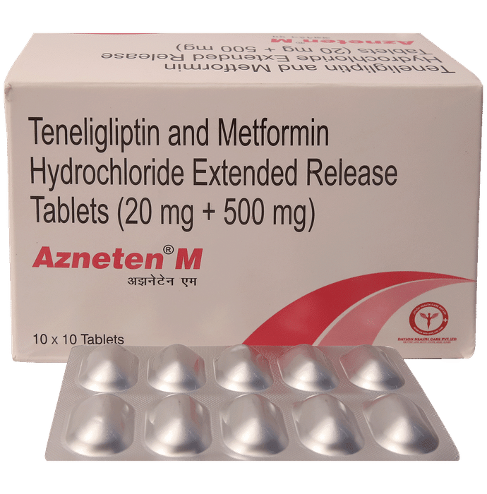 description:Azneten M Tablet ER is a combination of two medicines that control high blood sugar levels in people with type 2 diabetes mellitus. This helps prevent serious complications of diabetes such as kidney damage and blindness and may also reduce your chances of having a heart attack or stroke. Azneten M Tablet ER can be prescribed alone or together with other diabetes medications. All diabetes medicines work best when used along with a healthy diet and regular exercise. The dose you are given will depend on your condition, blood sugar levels, and what other medicines you are taking. Taking it with meals helps to reduce the chances of developing an upset stomach.You should take it regularly, at the same time each day, to get the most benefit and you should not stop unless your doctor recommends it. It is controlling your blood sugar levels and helping to prevent serious complications in the future. It is important to stay on the diet and exercise program recommended by your doctor while taking this medicine. Your lifestyle plays a big part in controlling diabetes.The most common side effects of taking this medicine include diarrhea, nausea, vomiting, upset stomach, and headache. Low blood sugar level (hypoglycemia) is a possible side effect if you are also taking other diabetes medicines like insulin or sulfonylurea, so you need to know how to recognize and deal with it.This medicine is not suitable for everyone. Before taking it, you should let your doctor know if you have ever had kidney, liver, or heart disease, problems with your pancreas, or if you drink a lot of alcohol. Pregnant or breastfeeding women should also consult their doctor before taking this medicine. Some other medicines can affect this one so tell your doctor about all the medicines you are taking to make sure you are safe. You should try to avoid drinking alcohol as it lowers blood glucose. Your doctor will check your kidney function and blood sugar levels before and during treatment.