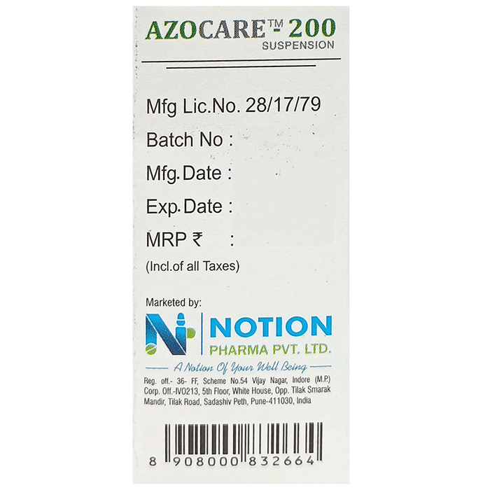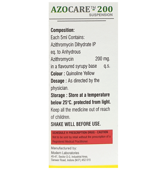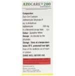 description:Azocare 200 Oral Suspension is an antibiotic medication. It is commonly given to children for the treatment of a wide range of bacterial infections targeting the ear, eyes, nose, throat, lungs, skin, and gastrointestinal tract. Azocare 200 Oral Suspension works by inhibiting the growth of the infection-causing bacteria and stopping it from multiplying. As a result of this, the spread of the infection is disabled. Azocare 200 Oral Suspension is usually given once a day, preferably in the morning. However, in the case of typhoid, it is to be given twice. Give it with or without food at about the same time each day. However, it is best given with food since children often have a sensitive stomach and could easily get a stomach upset.Medicine dose depends on the type of infection your child has, its severity, and your child’s age and body weight. So stick to the dose, time, and way prescribed by the doctor. In case your child vomits within 30 minutes of taking this medicine, give the same dose again.Your child may start to feel better within 2 days of regular dosing. However, you must still complete the full prescribed course of the medicine and never stop it abruptly as that may worsen your child’s condition or increase the risk of reinfection. Some of the minor and temporary side effects of this medicine include vomiting, diarrhea, nausea, and stomach pain. Usually, these episodes subside once your child’s body adapts to the medicine. However, in case these effects persist or become bothersome for your child, consult your child’s doctor without any delay.Inform your child’s doctor about any previous episode of any allergy, heart problem, liver impairment, and kidney malfunction. Knowing the child’s medical history is critical for dose alterations and for planning your child’s overall treatment.