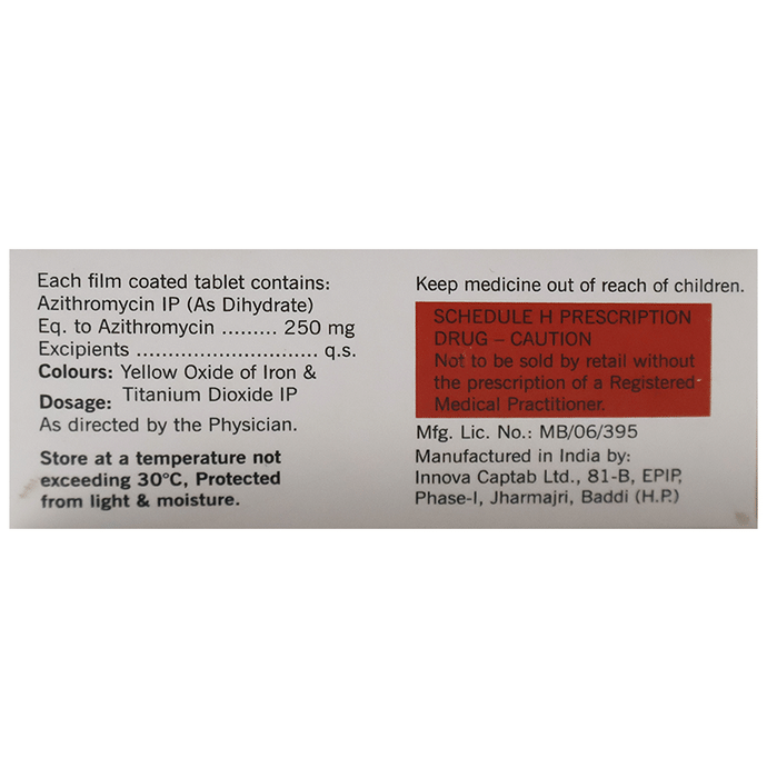 Azuthro 250 Tablet is an antibiotic used to treat various types of bacterial infections of the respiratory tract, ear, nose, throat, lungs, skin, and eye in adults and children. It is also effective in typhoid fever and some sexually transmitted diseases like gonorrhea. Azuthro 250 Tablet is taken orally, preferably one hour before or 2 hours after a meal. It should be used regularly at evenly spaced time intervals as prescribed by your doctor. Do not skip any doses and finish the full course of treatment even if you feel better. Stopping the medicine too early may lead to the return or worsening of the infection.Commonly seen side effects seen with this medicine include vomiting, nausea, stomach pain, headache, and diarrhea. These are usually temporary and subside with the completion of treatment. Consult your doctor if you find these side effects worry you or persist for a longer duration.Do not use Azuthro 250 Tablet if you have a history of cholestatic jaundice or hepatic dysfunction that happened with the use of azithromycin. Inform your doctor if you have any previous history of allergy or heart problems before taking this medicine. Pregnant or breastfeeding women should consult their doctor before using this medicine.