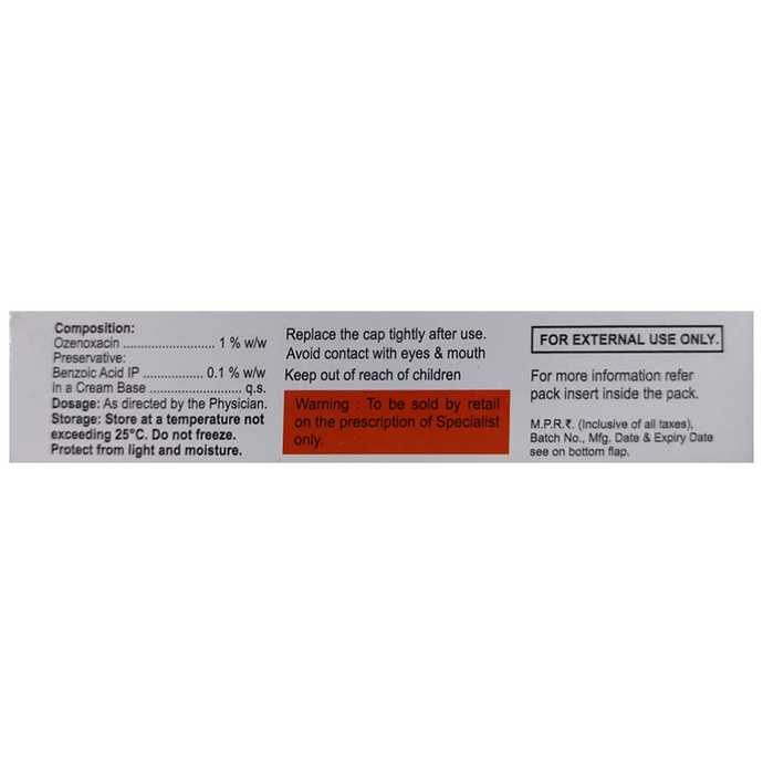 Marketer:Oaknet Healthcare Pvt Ltd,Composition:Ozenoxacin (1% w/w), medicine_typedrugs,Packaging Detail:tube of 10 gm Cream,                   Package:Tube,Qty:10 gm,Product Form:Cream, prescription_required:Prescription Required,primary_use: